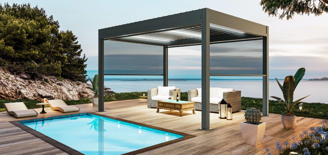 Vertical Shading zip systemn | The optional vertical shading system with zip in one, two, three or even four sides of the pergola ensures maximum sun and insect protection, while maintaining visibility thanks to the perforated net material. The vertical shading system is motorized in the motorized pergola. |  |